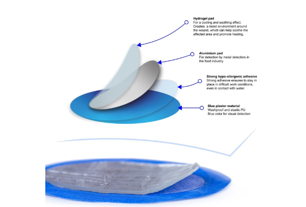 Pansements hydrogel bleus détectables, pour les utilisateurs professionnels de l'industrie agroalimentaire, de la restauration et des cuisines industrielles. Ces pansements imperméables et élastiques sont conformes aux normes HACCP en vigueur.